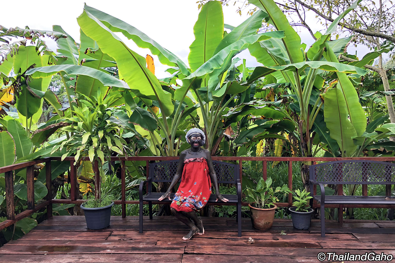 塗った後は真っ黒になった体のまま、シャワー室から出てきます。次に、フェイシャルパックです。フェイシャル用の泥パックは、泥にヨーグルトを混ぜたものだそうです。目と口を除いて、刷毛で顔に泥パックを塗ってもらいます。全身真っ黒になったところで、泥が乾くまでオープンエアのテラスで30分ほど待ちます。最初は黒かった泥が、乾くとグレーになってパリパリになって来ます。時間が来たら再度シャワー室に行き、全身の泥をこすり落とします。さらに、タマリンドを配合したボディスクラブで体を磨き上げて、最後に温泉プールに入ります。